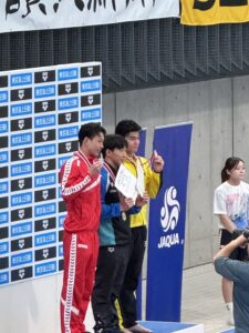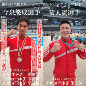 100mに関しては、日本高校生歴代2位の記録を残し、ジュニアオリンピックの大会新記録を約0.3秒更新する力泳でした。また、同種目15-16歳区分では、菊入實選手(高1)も3位入賞。練習を共にする2人の一泳入魂が見られたレースでした。