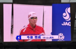 レースでは、100m平泳ぎで今泉悠成選手(ダッシュ新津:高2)が、ダッシュ史上初の現役高校生で決勝に進出。トップスイマーたちとの熱いレースの中、大健闘の6位入賞。また、社会人スイマーの髙﨑有紀選手が50m平泳ぎで7位入賞。フルで仕事をしながら、日本選手権決勝の舞台に立つのは容易でないことです。