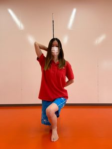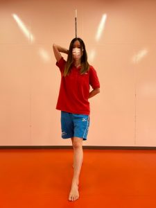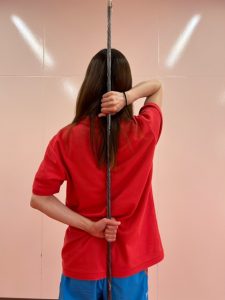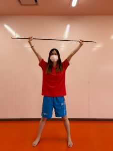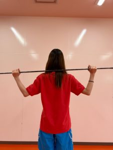 1 背骨に沿ってバーを持ち、頭・背中・お尻の真ん中にバーをあてる