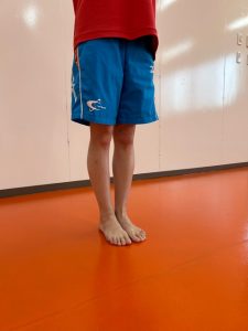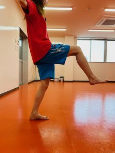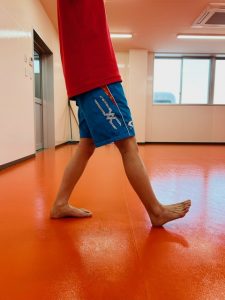 3 身体をまっすぐにして、右足を上げて踵で着地する