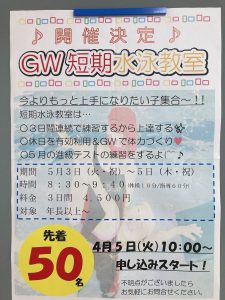 今週からゴールデンウイークに開催する短期教室のお申し込みが