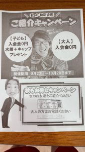 三条では、フロント前のポスターにもあります、スポーツの秋・スイミングの秋ということで