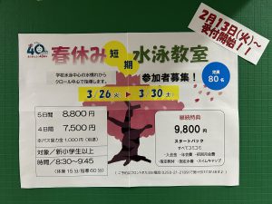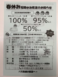 春休み短期水泳教室のお知らせです。
