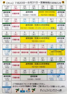 また、来週10日(日)~16日(土)はスクール休校とお盆の休館日があります!
