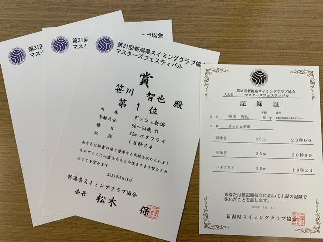 さて、マスターズフェスティバル開催本部より賞状と記録証が届きました。