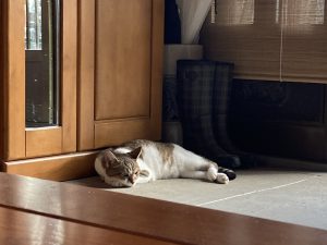夏の暑さにやられて玄関のコンクリートで涼んでいました。食欲も少し落ちているようで4.8キロあった体重が今は4.2キロとちょっとスッキリしてましたが、まだまだBIGニャンコです(笑)