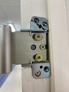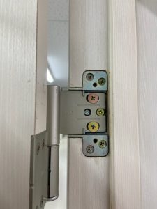 この扉はもともと内開き設計のものを外開きに変更したもので少し強く開けると蝶番に負担がかかり今まで何度かネジが抜けてしまい、すぐ破損してしまっていました…