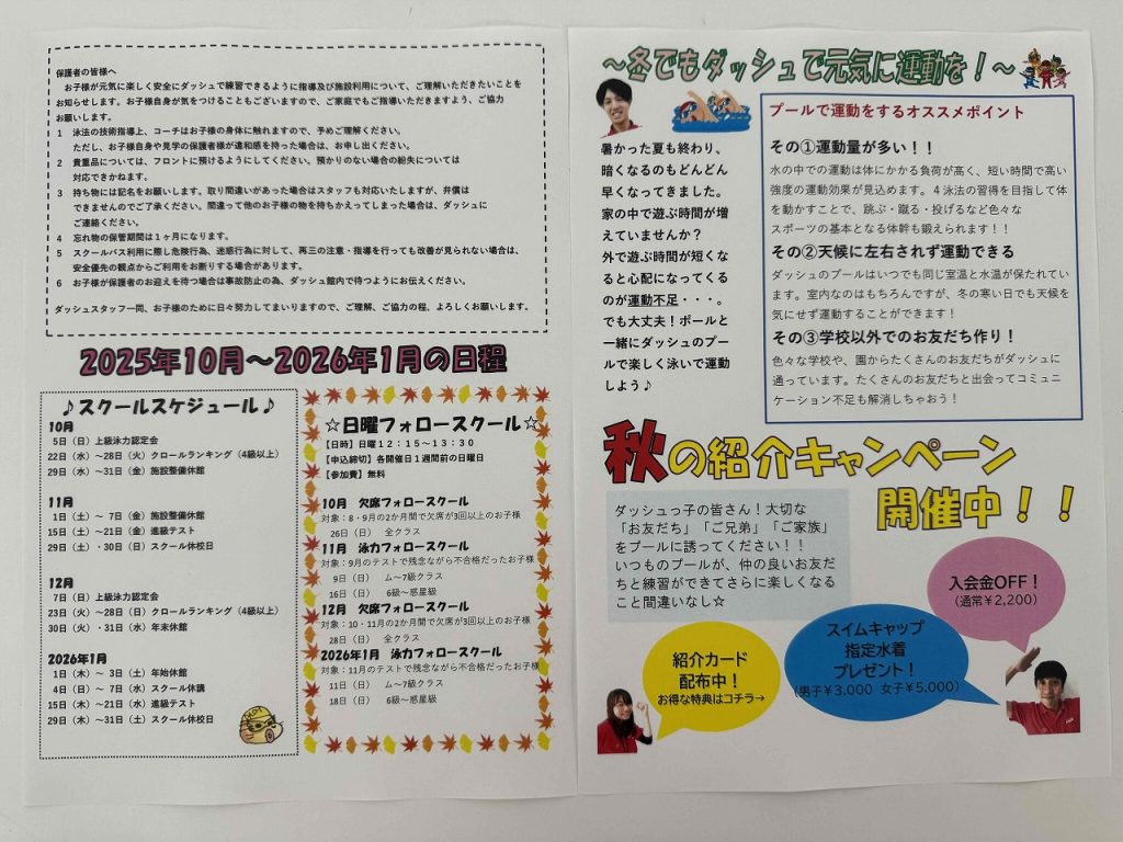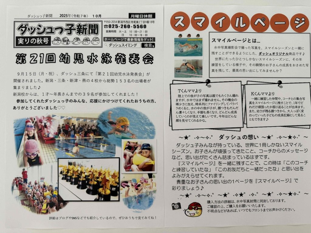 9月に行われた幼児水泳発表会の様子や、今後のスクールの予定などが掲載されています