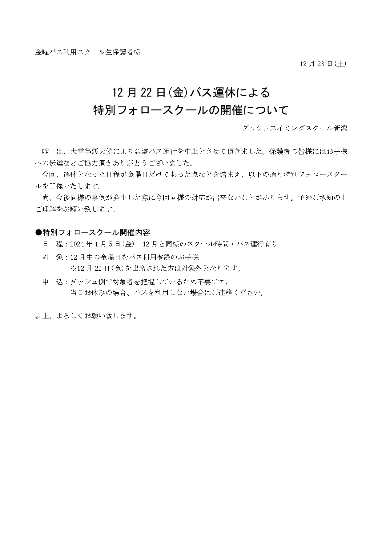 バス運休によりスクールへ参加が出来なかった方への対応については改めてご連絡をさせて頂きます。
